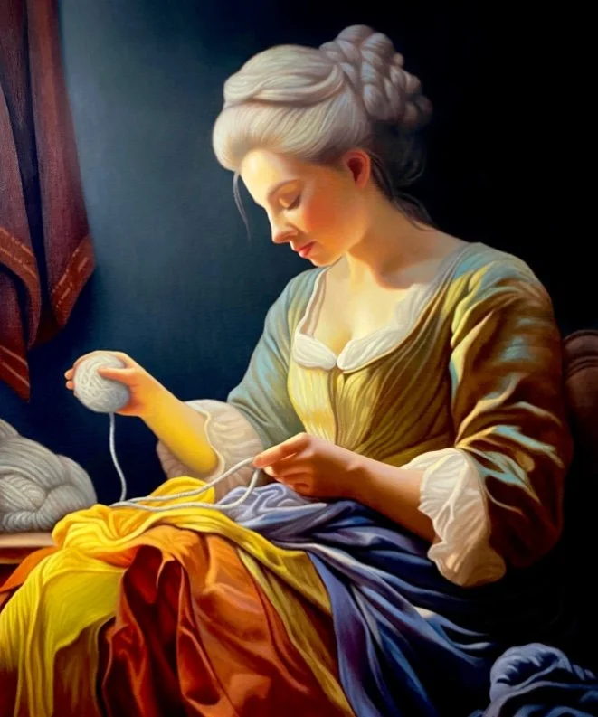 A contemplative portrait that explores themes of secrecy, perception, and the tension between what is seen and what is hidden. Inspired by the true story of a woman who used balls of yarn to smuggle secrets during wartime, this painting invites the viewer to lean in and look closer. Subtle details suggest there is more beneath the surface. This piece asks what truths we miss when they are laced within the ordinary.